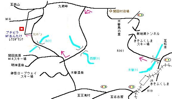 名古屋方面からは中央道中津川IC下車、それからR19を北に走ります。中津川より1時間ほどで